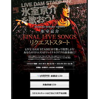 なお「LIVE DAM STADIUM」からのリクエストの受付は、2015年11月9日(月)~2016年1月11日(月・祝)までで、このLIVE DAM STADIUMでの歌唱ランキングと、今後行なう予定のWEBでのリクエスト投票ランキングの結果を取り入れて、氷室自身がファイナルライブのセットリストを考案する予定だ。