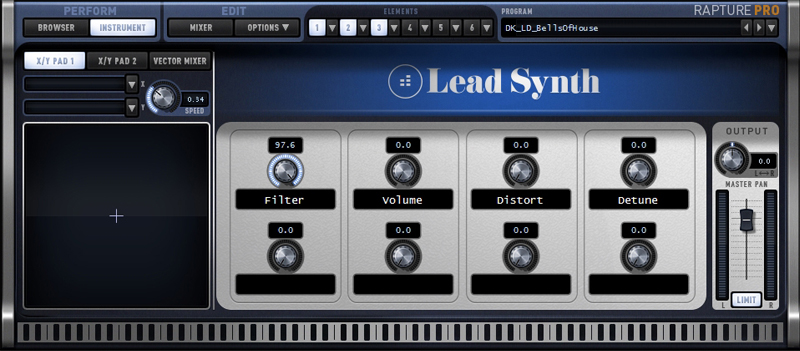ステージパフォーマンス向きの「インストゥルメントページ」を搭載しているのが特徴で、作成した6つのサウンド(下記のエレメントページで設定)をグラフィカルにミックスできる「ベクトルミキサー」や、任意のパラメーターを8つまでアサイン可能な「マクロつまみ」を使って直感的な演奏ができる。