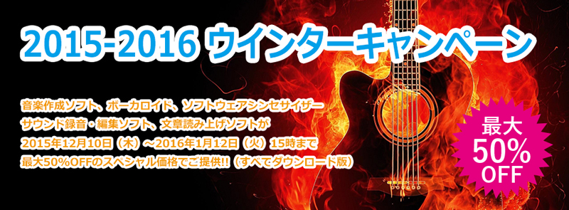 株式会社インターネットでは『2015-2016ウィンターキャンペーン』を開催中だ。こちらのキャンペーンは、同社が運営するオンラインショップ「shop.ssw.jp」において、ダウロード版のソフトウェアが最大50%OFFのスペシャル価格で購入ができるというもの。ABILITYやSinger Song Writerなどの購入を考えている人はこのチャンスを逃さないでほしい。期間は2016年1月12日(火)15時まで