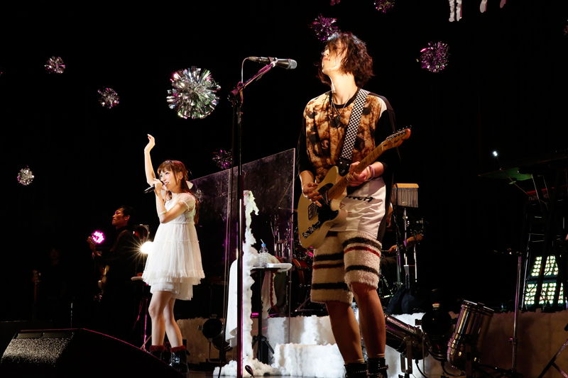 その後の「キャミソール」では上着を脱ぎ、甘いサウンドに身体を左右に揺らしながら、キュートに歌い上げる。そして「If -君が行くセカイ-」、続く「kissing」では再度立ちあがった観客にマイクを向け「オーケー!」とそのレスポンスを楽しみながら、Billyもステージを練り歩きギターソロではパワフルな演奏で魅了。ステージ幕をチェンジし、色とりどりの照明の下でロックサウンドを響かせた「wonder」では、神田がBillyに寄りかかったりと息ぴったりのパフォーマンスで、会場をさらなる熱気で包んだ。