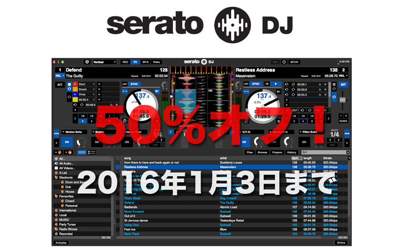 ディリゲントでは「Serato DJ」半額キャンペーンを開催中だ。こちらはDJコントローラのためのソフトウェア「Serato DJ」が特別価格で購入できるというもの。