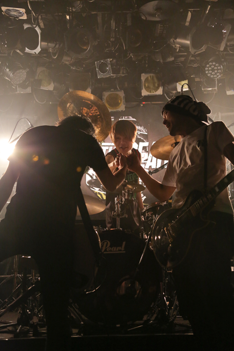 「全てを」で本編は締め括られたが「最初から! 最初から!」という熱い声と手拍子に応えて行なわれたアンコール。最初にステージに戻ってきた桑原がスタッフからギターを手渡されたので、観客はザワつく。次に登場した越智が手にしたのはベース。ドラムにスタンバイしたのは、なんと「SECRET 7 LINE」のTAKESHI! 3人が演奏をスタートさせると、池田が歌いながら登場。