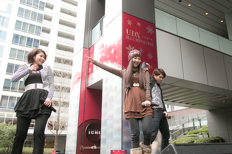 13時ちょうどにイベントがスタートすると、まずはオープニングテーマを歌うAKINO with bless4が、UDXアキバ広場に特設されたステージに登場。“お兄ちゃん”の愛称で知られるAKASHIが「みなさん楽しんで行きましょう! 一緒に歌ってください」と観客を煽ると、集まった約500人のファンから歓声があがる。まずは、オープニングテーマの『Golden Life』からスタート。メンバー3人がステージ上で激しいパフォーマンスを見せると、ファンはそれにペンライトと声援で応え、まるで野外フェスのような盛り上がりを見せた。1曲目が終わると、メンバーのAKASHI、KANASA、AKINOが自己紹介し、寒空の下でイベントの開催を待ち続けてくれたファンに感謝の言葉を述べる。「アクティヴ」と「レイド」のコール&レスポンスで会場を暖め、続いて2曲目の『OVERNIGHT REVOLUTION』を披露した。