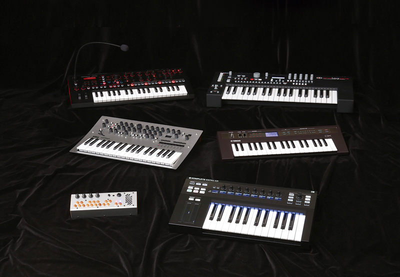 今回試奏したシンセ。左上より時計回りで、ローランドJD-Xi、エレクトロンAnalog Keys、ヤマハreface DX、ネイティブ・インストゥルメンツKOMPLETE KONTROL S25、クリッター&ギターリPocket Piano MIDI、コルグminilogue