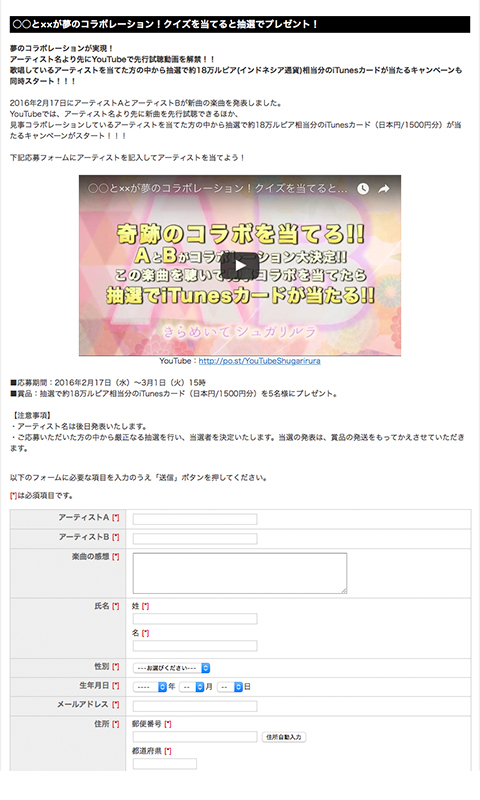 現在YouTubeでは、その新曲を先行試聴できる他、コラボレーションしているアーティストAとアーティストBを見事に当てた方の中から、抽選で約18万ルピア(インドネシア通貨)相当分の、iTunesカード(日本円/1500円分)がプレゼントされるキャンペーンを開催しているので、コラボレーションしているアーティストがわかった! という人は応募フォームにアーティスト名を記入して、賞品をGETしよう!