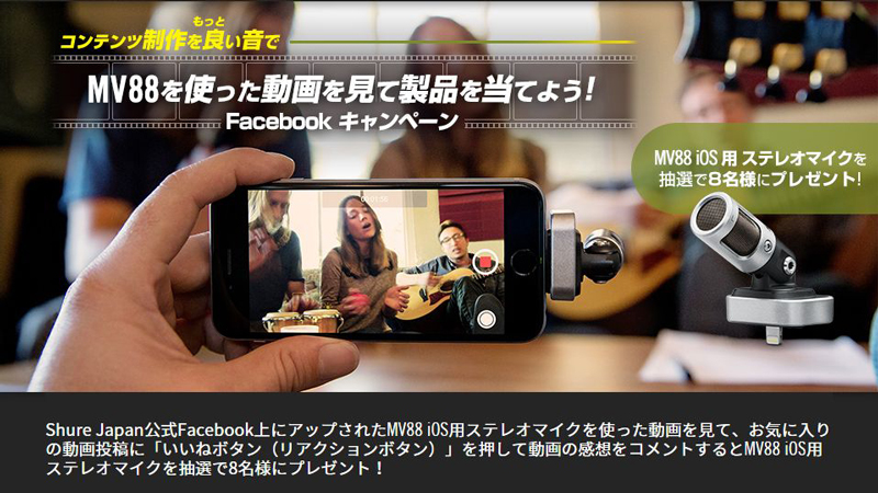 シュア・ジャパンでは「MV88を使った動画を見て製品を当てよう!Facebookキャンペーン」を開催中だ。こちらのキャンペーンは、同社の公式Facebook上にアップされた「MV88」iOS用ステレオマイクを使った動画を見て、お気に入りの動画投稿に「いいねボタン(リアクションボタン)」を押して動画の感想をコメントするというもの。その中から抽選で8名に「MV88」iOS用ステレオマイクがプレゼントされるという。詳しくはこちらをチェック。