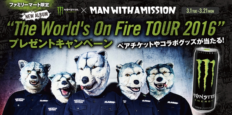 こちらのキャンペーンは、2016年3月1日(火)~3月21日 (月)の期間中、全国のファミリーマート店舗(約11,600店舗)にてモンスターエナジーの対象商品を購入すると、総勢880名に抽選でライブ鑑賞ペアチケットやコラボクーラーバッグなどをプレゼントするというもの。