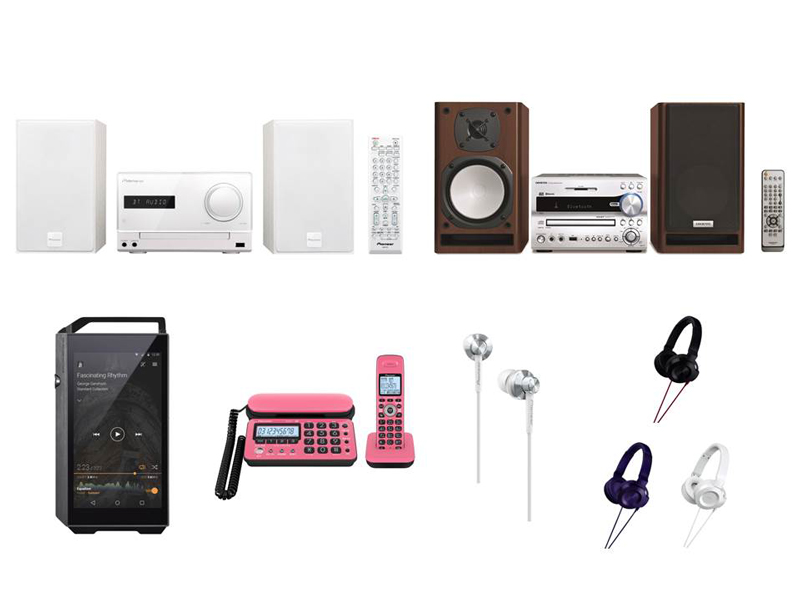 左からCDミニコンポーネントシステム「X-CM35-W」とCD/SD/USBレシーバーシステム「X-NFR7X(D)」。下段左からプレゼント商品のデジタルオーディオプレーヤー「XDP-100R-K」、デジタルコードレス留守番電話機「TF-SD10S-PK」、密閉型インナーイヤーホン「SE-CL522-W」、オーバーヘッドタイプヘッドホンの3機種「ES-FC300(V)」「ES-FC300(R)」「ES-FC300(W)」。