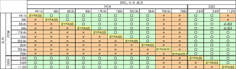 ※1 PCM705.6k、768kの音源はDSDに変換して再生してください。BYPASSモードでの再生は本機の性能の保証外