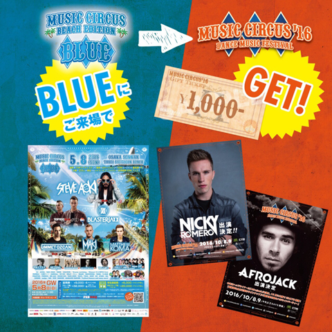 5月8日(日)に大阪泉南・タルイサザンビーチにて行われる日本独自の世界標準EDMフェス『BLUE by MUSIC CIRCUS』の来場者に、10月に開催される『MUSIC CIRCUS ‘16』会場内の ドリンク・フード・物販で使える「金券(¥1000分)」をプレゼントするキャンペーンを行なう。