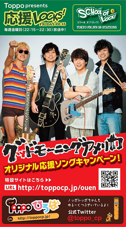 続く第2弾は、7月4日(月)にTOKYO-FMにて特番「トッポ×グッドモーニングアメリカ×SCHOOL OF LOCK!」がオンエアされる予定だ。