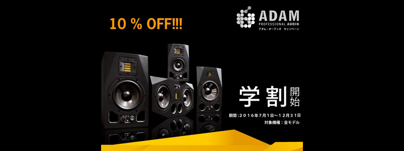 ADAM Audioでは現在学生割引キャンペーンを実施中だ。今回のキャンペーンでは、期間中に対象製品(ADAM Audio F-シリーズ、AXシリーズ、SXシリーズ)を購入すると通常販売価格の10%割引されるというもの。期間は2016年12月31日まで。詳しくはこちらをチェック。