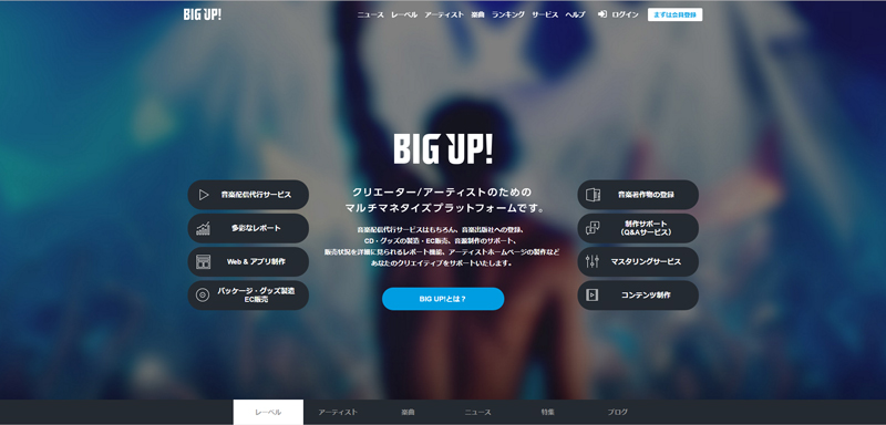 「BIG UP!」とは、アーティストやクリエイターが自分で作った音楽を、簡単な登録操作だけで世界112カ国へ販売することが可能なサービスで、その販売状況を確認できるレポート機能の他、自らのホームページの制作やCD・グッズの受託製造やEC販売、音楽出版社への登録、はたまた音楽制作における様々なサポートを受けることがこれ1つで全て出来てしまうという、まさにアーティストやクリエイターにとって新しいビジネスモデルの提案とサービスを体現したマルチマネタイズプラットフォームなのである。