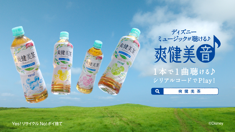 期間中は、本キャンペーンのために特別にデザインしたミッキーマウスのシルエットが印象的なオリジナルパッケージと、ディズニーの歴史を彩ってきた数々の名曲の、“爽やかに リフレッシュアレンジ”、“健やかに ポジティブアレンジ”、“美しく リラックスアレンジ” 、“音を楽しむ スタンダードバージョン(原曲)”といった「爽健美茶」オリジナルアレンジの楽曲などを楽しむことができる。