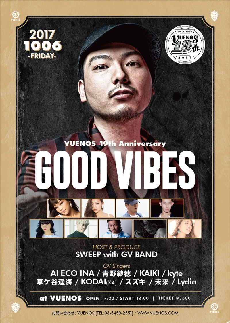 また、10/6(金)には、VUENOS 19周年としてSWEEP主催のレギュラーイベント”GOOD VIBES”を開催!実力派のシンガーが集結し、生バンドで名曲の数々をカバーする一夜限りのスペシャルな内容で渋谷VUENOSの19周年をお祝いする。