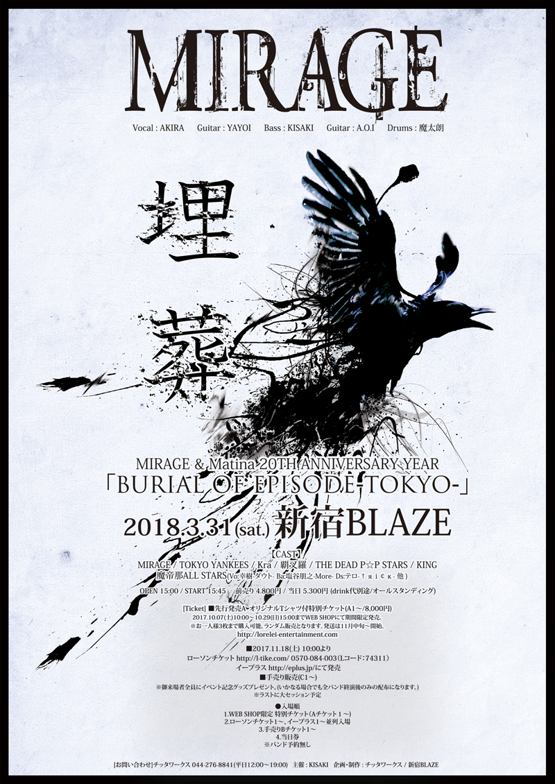 さて、ここからが本題だ。2018年3月31日、新宿BLAZEを舞台に『MIRAGE&Matina 20TH ANNIVERSARY YEAR「BURIAL OF EPISODE -TOKYO-」』と題したイベントの開催をKISAKIが発表した。「MIRAGE」というバンドも、「Matina」というレーベルも、ちょうど20年前となる1997年にKISAKIが立ち上げている。記念日をことさら大切にするKISAKIらしく、「20年という節目の年を祝宴の記憶」としてファンたちの胸に、何よりKISAKI自身の心に刻もうと、今回のイベントの開催を決意した。