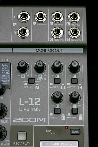 また、L-12はメインアウトとは別に、独立したミックスバランスを設定できる5系統のヘッドホン出力を備えているので、例えばリハスタなどでバンドレコーディングをする際に、メンバー5人それぞれの好みに合わせたミックスバランスを出力することも可能です。そして、それらはすべてツマミではなく、フェーダーで視覚的に確認できます。