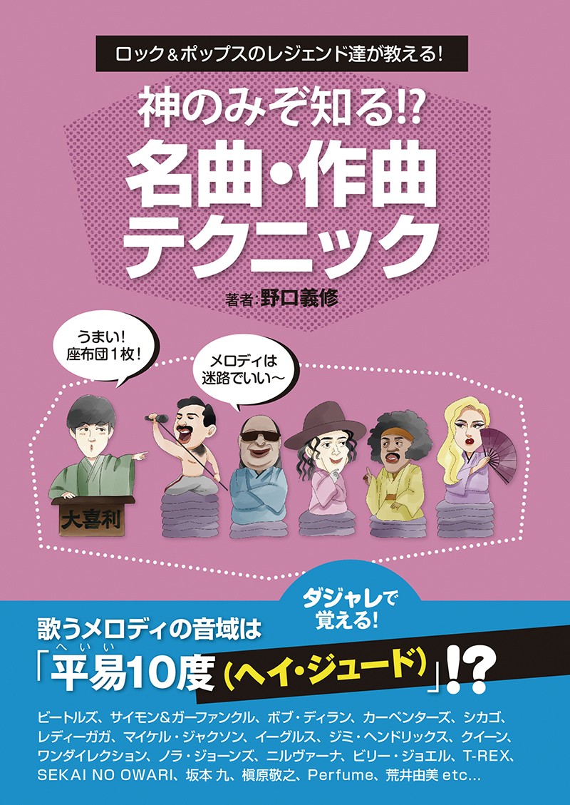 この本は、洋邦のロック・ポップスの名曲を題材に、作曲をするうえで覚えておきたいコード理論やメロディの作り方などのノウハウを、著者の野口義修氏ならではのダジャレを交えた軽妙な文章でわかりやすく紹介するという、これまでになかったタイプの作曲本で、アーティストや楽曲にまつわる逸話も数多く盛り込んでおり、ロック・ポップスのエピソード集としても楽しめる内容になっている。
