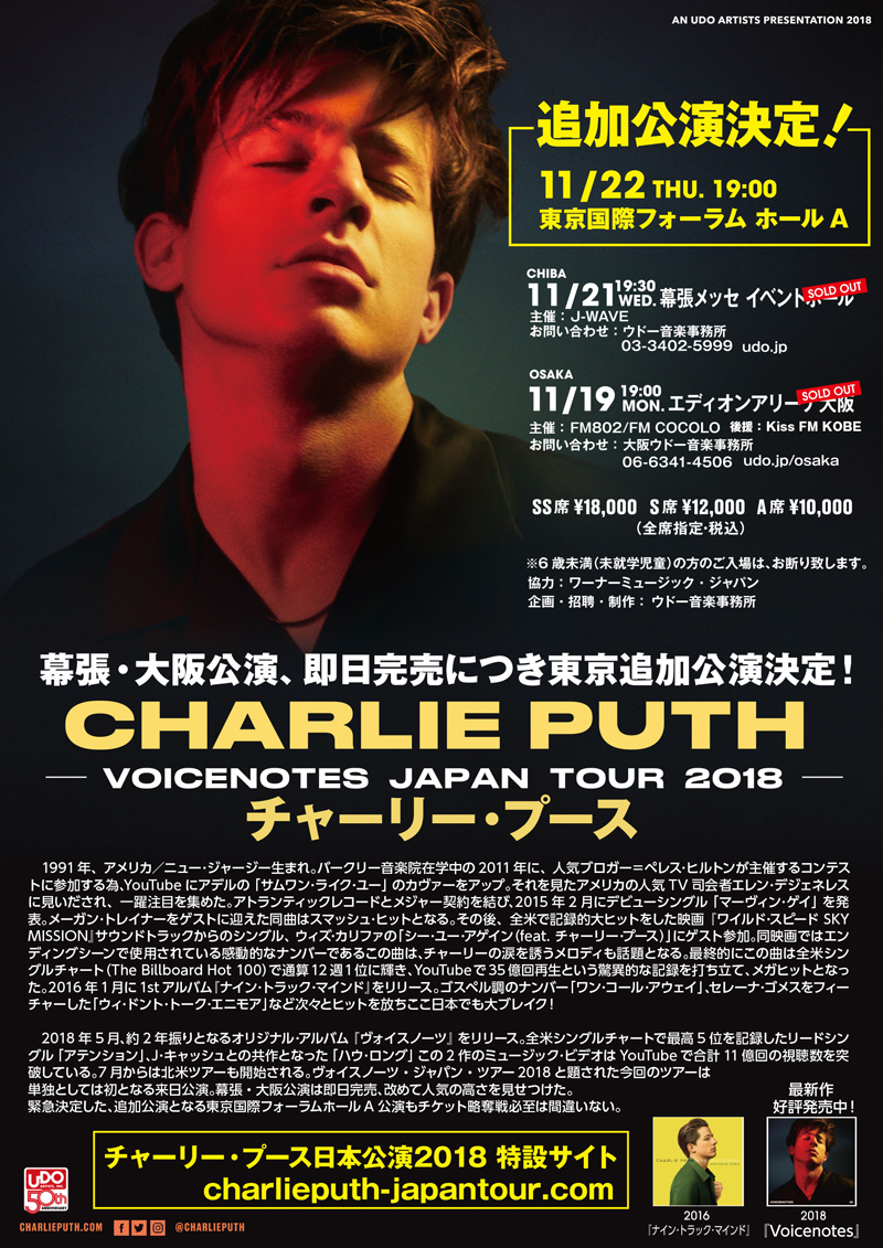 幕張・大阪公演が即日完売したチャーリー・プースの「CHARLIE PUTH VOICENOTES JAPAN TOUR 2018」。大反響に応え東京追加公演が決定した。