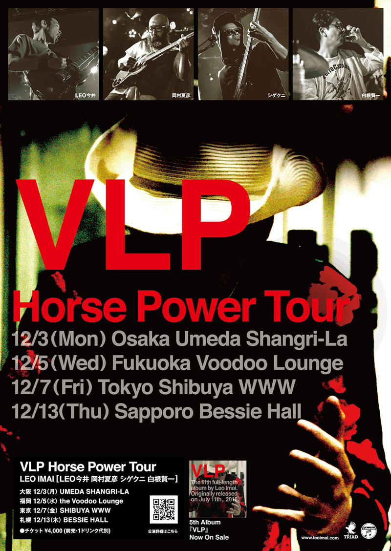 LEO今井が、7月11日に発売した5枚目のアルバム『VLP』を引っさげたツアー「VLP Horse Power Tour」の追加公演を発表。バンドとして初の札幌公演を12月13日に北海道・札幌BESSIE HALLで開催する。