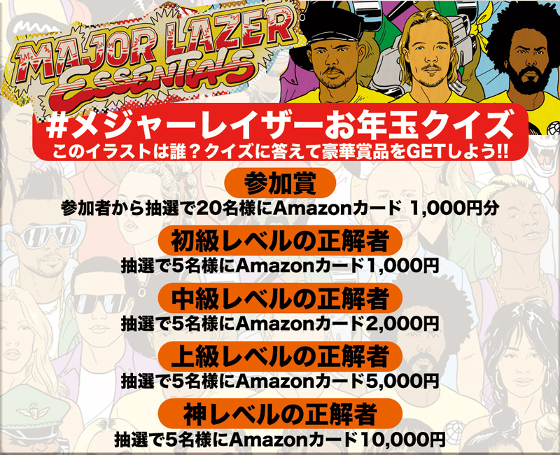 来年でデビュー10周年となるメジャー・レイザー、全キャリアから余すことなくヒット曲を集めた『ベストヒット: メジャー・レイザー / Major Lazer Essentials』日本盤がついにリリース! この発売を記念して、メジャー・レイザーの少し早いお年玉クイズを開催する事が決定した!
