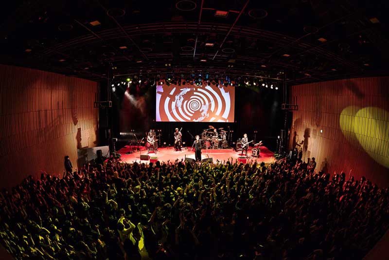 「不均衡キネマ」が盛大に炸裂すると、本編はいよいよ終盤へ。「犬型真性MASOCHIST」などのアグレッシヴで猥雑な楽曲の数々を繰り出し、「Midnight Shangrila」をきらびやかに轟かすと、5人はステージを後にした。